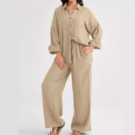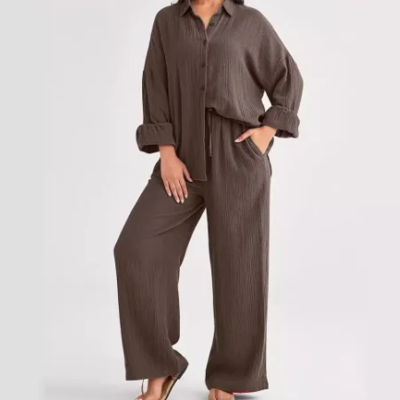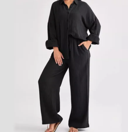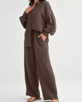Fashion Solid Set Lady Casual Long Sleeve Button Shirt Tops High Waist Wide Leg Pants Two Piece Sets For Women Spring Autumn New